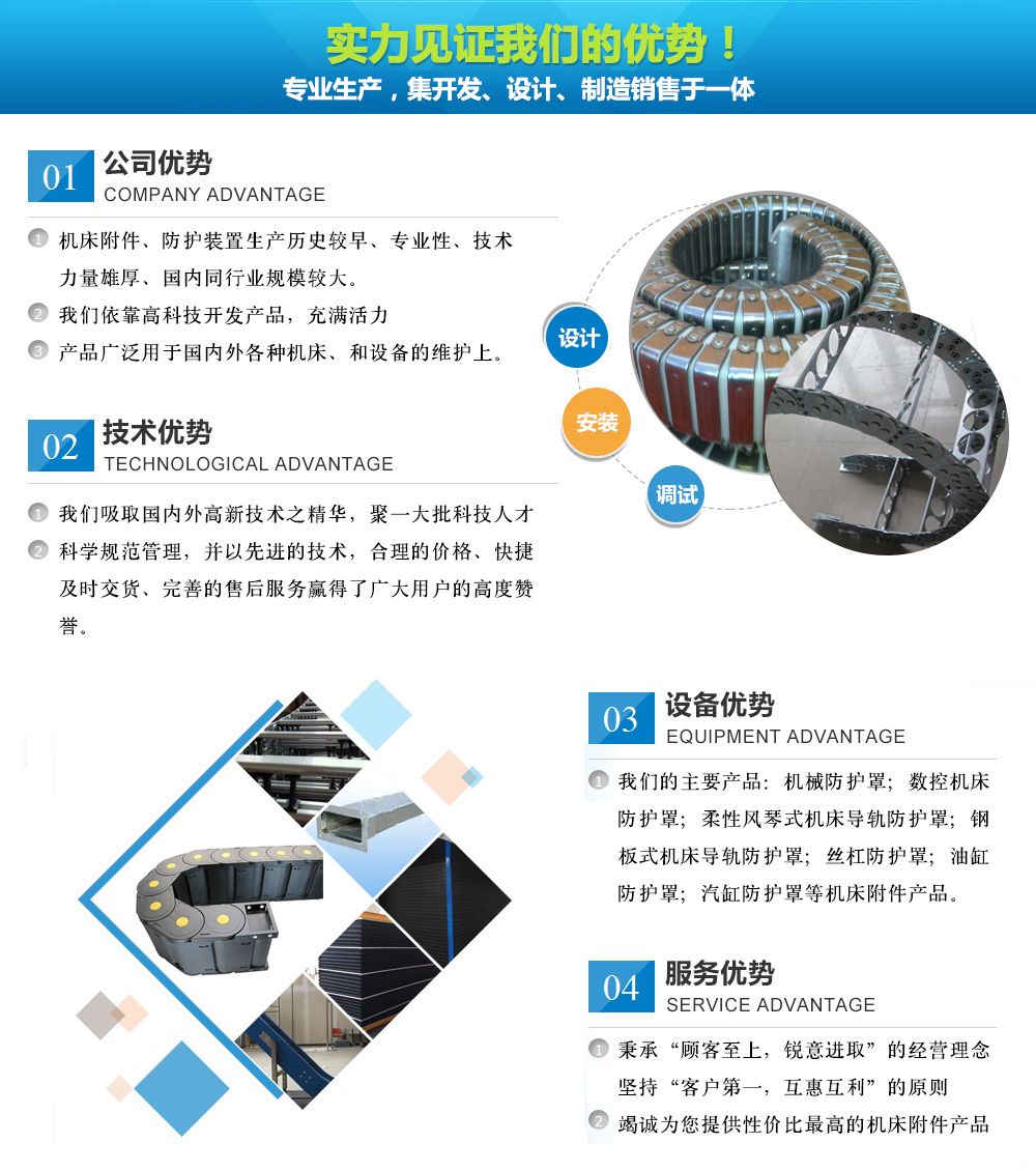 蘇州韻水機(jī)床附件有限公司 ,是專業(yè)生產(chǎn),集開(kāi)發(fā)、設(shè)計(jì)、制造銷售于一體,是機(jī)床附件、防護(hù)裝置生產(chǎn)歷史較早、專業(yè)性、技術(shù)力量雄厚、國(guó)內(nèi)同行業(yè)規(guī)模較大。我們依靠高科技開(kāi)發(fā)產(chǎn)品,充滿活力,產(chǎn)品廣泛用于國(guó)內(nèi)外各種機(jī)床、和設(shè)備的維護(hù)上。我們的主要產(chǎn)品:機(jī)械防護(hù)罩;數(shù)控機(jī)床防護(hù)罩;柔性風(fēng)琴式機(jī)床導(dǎo)軌防護(hù)罩;鋼板式機(jī)床導(dǎo)軌防護(hù)罩;絲杠防護(hù)罩;油缸防護(hù)罩;汽缸防護(hù)罩;耐高溫防護(hù)罩;盔甲式防護(hù)罩;焊接防護(hù)罩;螺旋鋼帶防護(hù)罩;風(fēng)琴式防塵折布防護(hù)罩;醫(yī)療器械防護(hù)罩;精密儀器防護(hù)罩;升降機(jī)防護(hù)罩;鋁型防護(hù)簾;托架式卷簾防護(hù)罩;盒式卷簾防護(hù)罩;自動(dòng)伸縮式鋼帶;機(jī)床排屑機(jī);還有可調(diào)塑料冷卻管...
